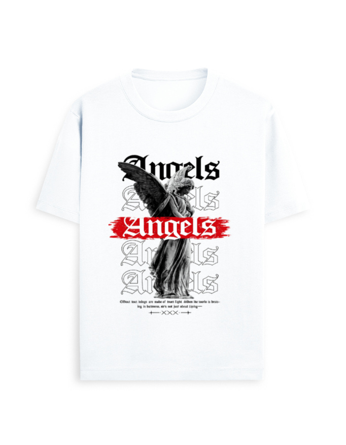 The Angels Gothic Graphic T-Shirt merges classical sculpture imagery with contemporary graphic design. The artwork features a detailed angel statue paired with layered gothic typography, creating a dramatic and artistic visual that blends heritage-inspired art with streetwear style.