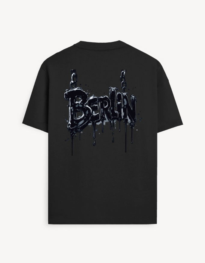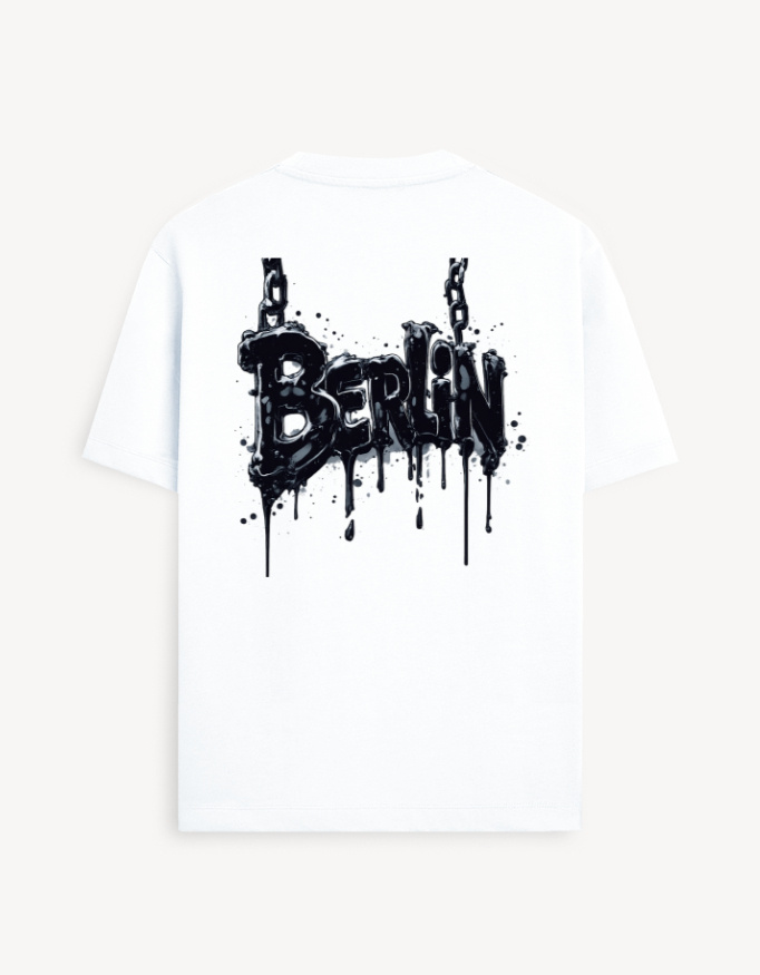The Berlin Drip Typography Graphic T-Shirt brings a raw street-style attitude through heavy typography and liquid-drip detailing. The design features bold lettering suspended by chains, creating the visual of melting metal and rebellious urban energy.