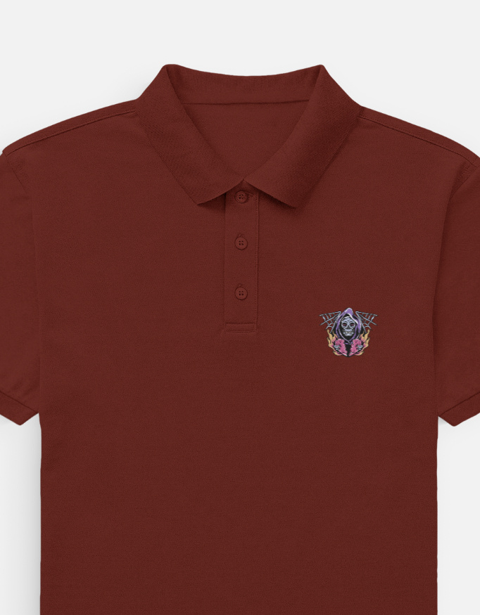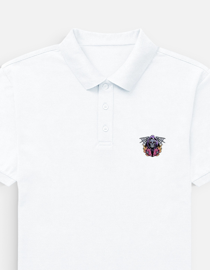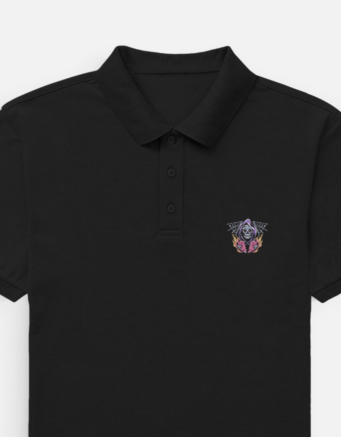 Step up your everyday style with this exclusive polo featuring a finely detailed Grim Reaper mini-embroidered graphic. Sleek, minimal, and striking — this design adds a bold artistic edge without overpowering your outfit.