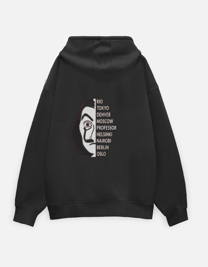 Channel the mindset of a master plan with the Money Heist Edition Hoodie. Featuring a bold masked-face graphic paired with iconic city names from the legendary heist storyline, this hoodie represents unity, chaos, and calculated rebellion.