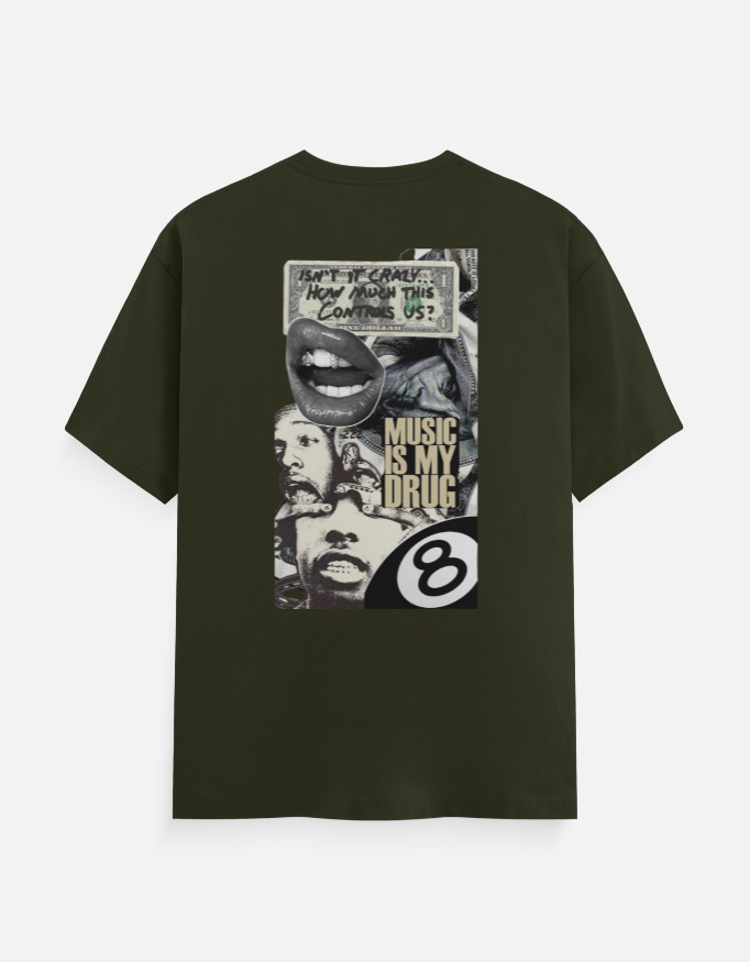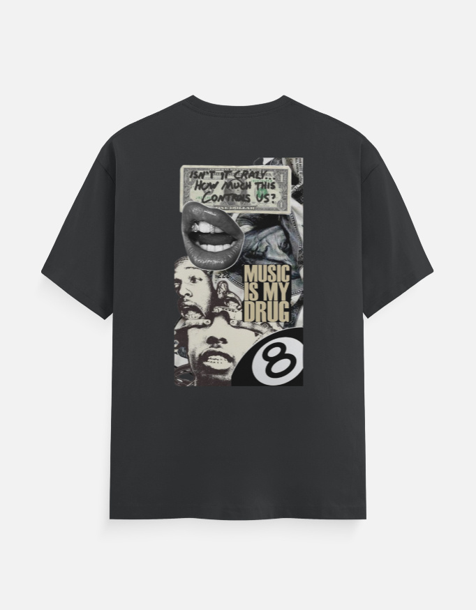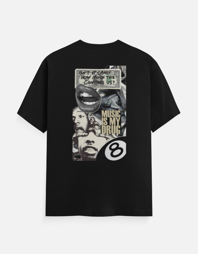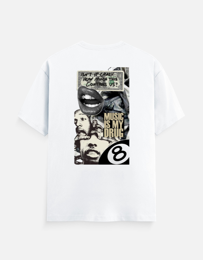 The MUSIC IS MY DRUG – Graphic Collage T-Shirt is made for those who don’t just listen to music — they live it. Designed with a gritty collage of expressive faces, currency textures, bold typography, and iconic street elements, this tee captures the rebellious, addictive energy of music culture.