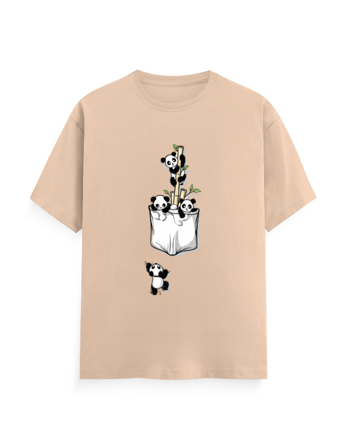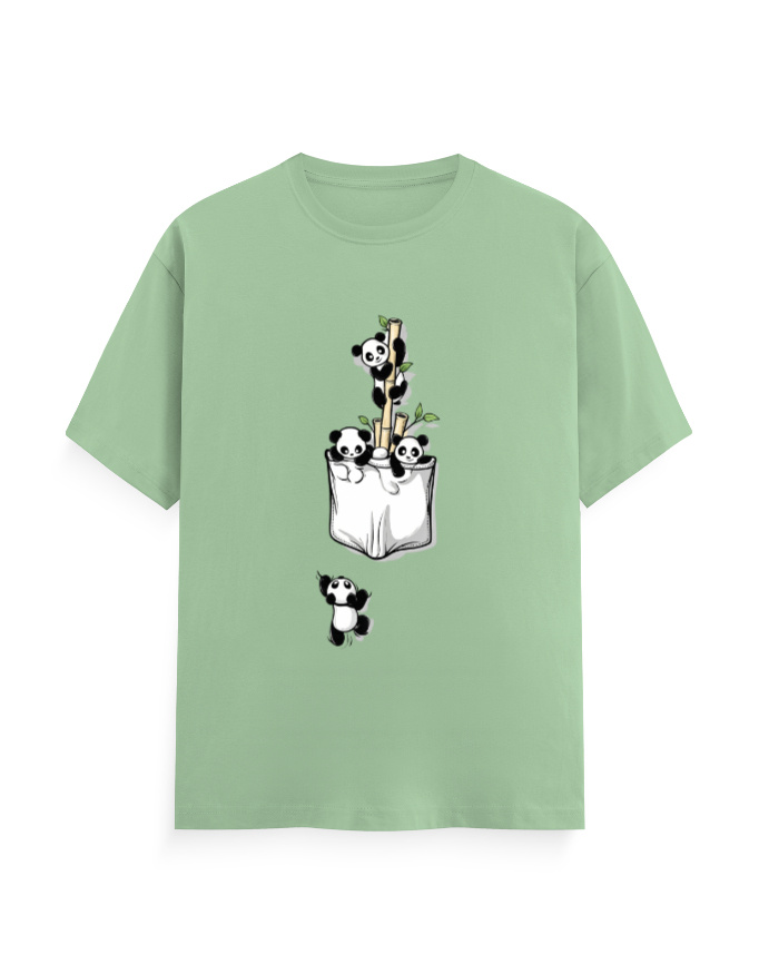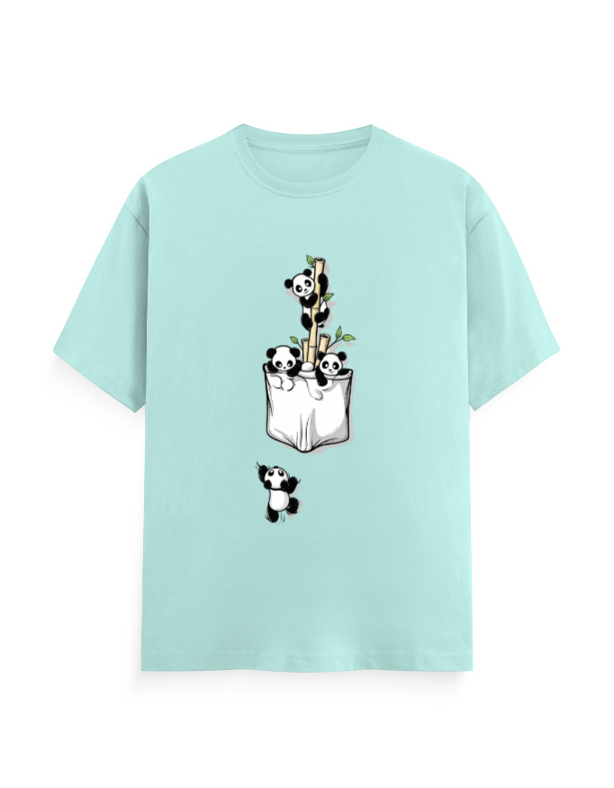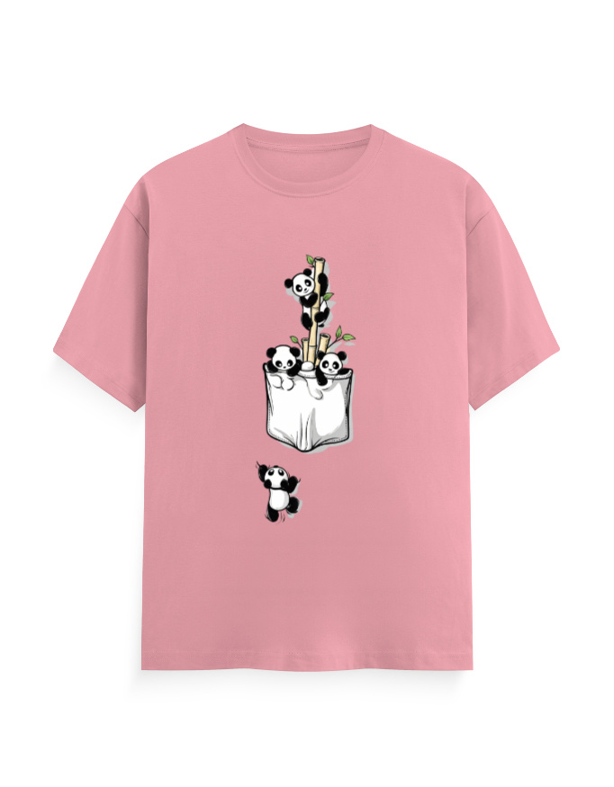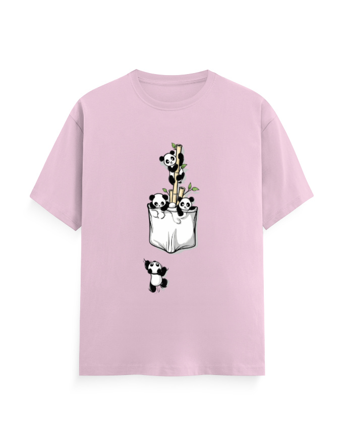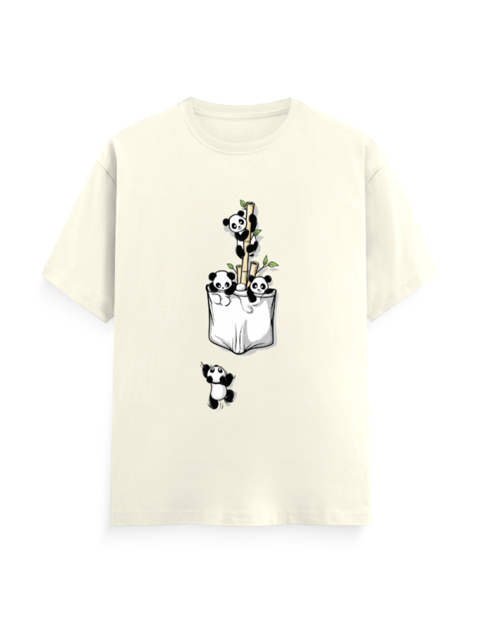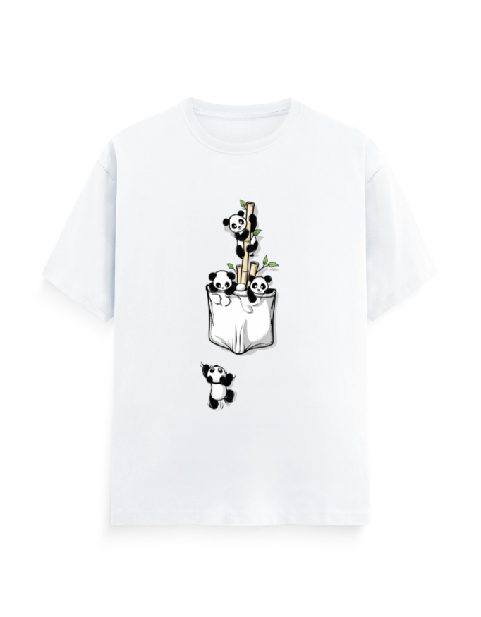 A playful graphic t-shirt featuring adorable panda illustrations climbing out of a pocket, designed for fun-loving style and everyday comfort.