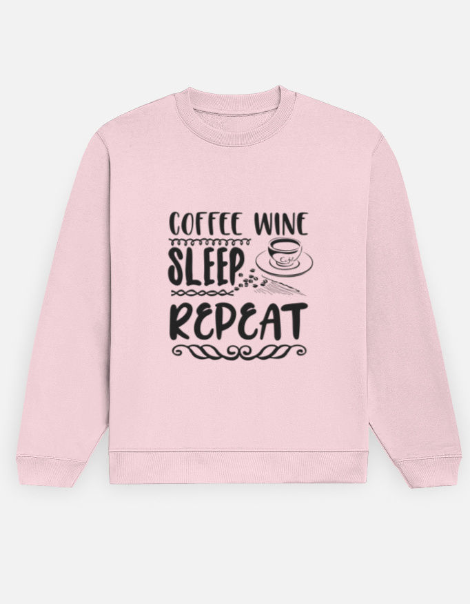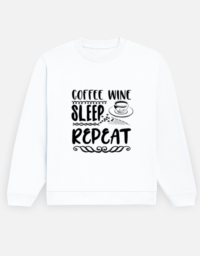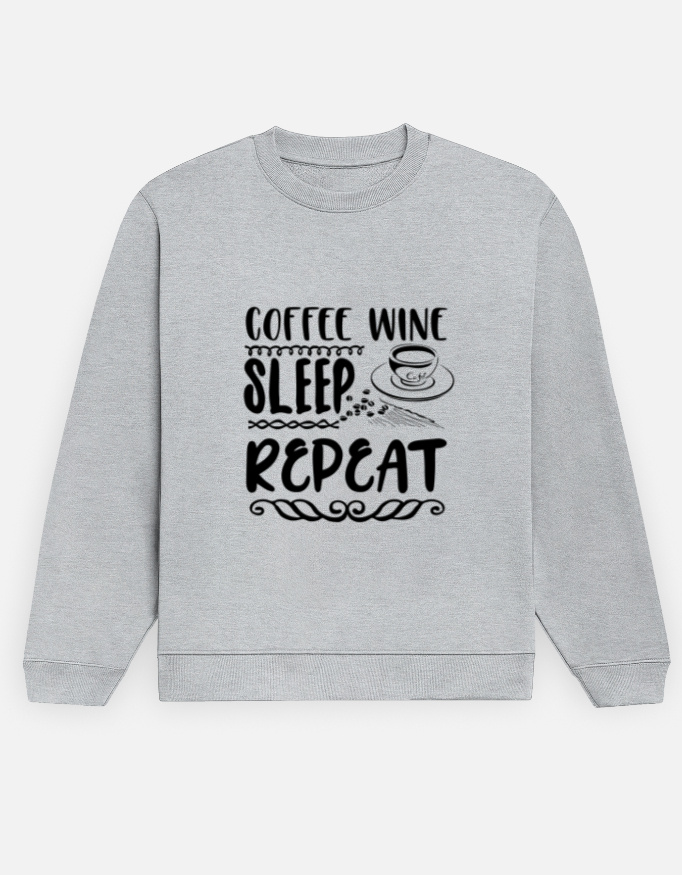 The Coffee Wine Sleep Repeat Sweatshirt perfectly sums up modern-day rhythm — fueled by caffeine, relaxed with wine, powered by good sleep, and ready to do it all again.